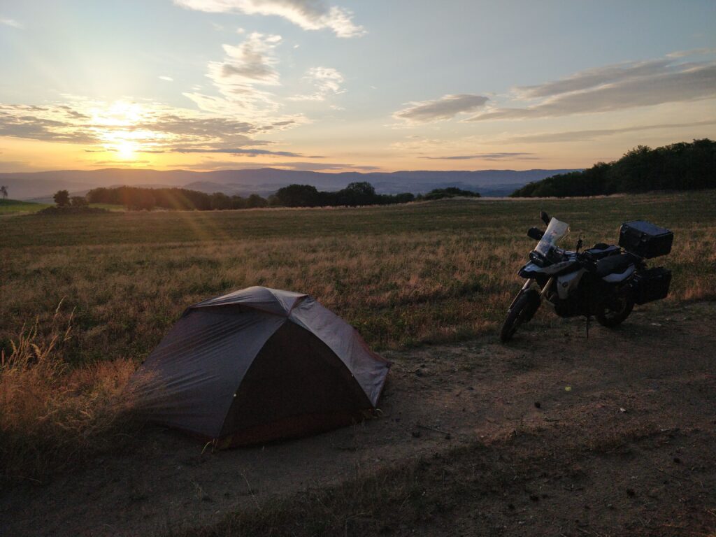Je décide donc de monter sur les hauteurs et me trouve un coin au milieu des champs. Ici je ne dérangerai personne, il n’y a aucun bruit et la vue est belle. J’ai une vue imprenable sur les averses qui se déversent en contrebas dans la vallée. Une fois encore j’ai le micro climat gagnant.