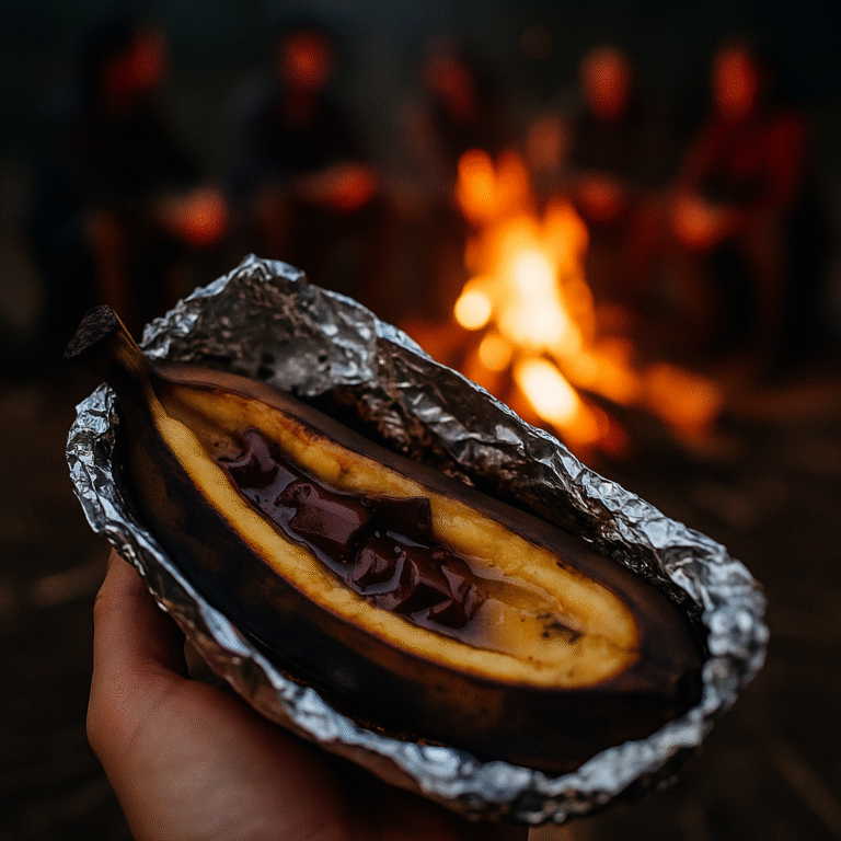 Un dessert de bivouac simple et fondant, où la banane mûre grillée au feu s’imprègne de chocolat fondu, pour un résultat réconfortant.